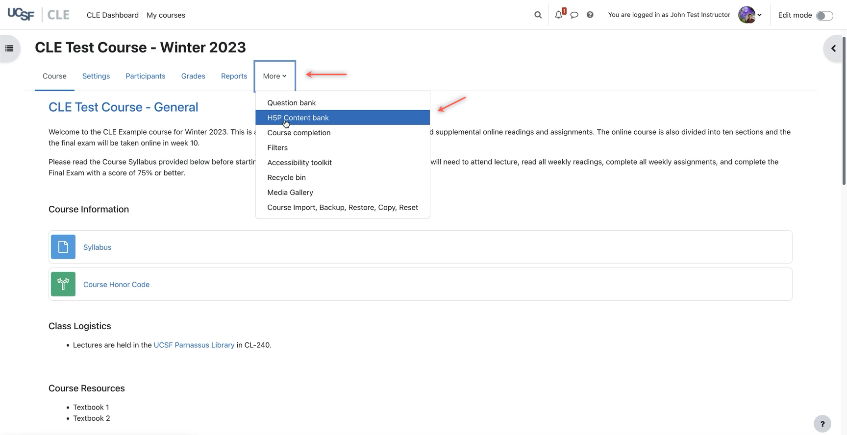 1. H5P modules can be managed through the H5P Content Bank available in each course. To create H5P content, log in to your CLE course and click the H5P Content Bank in the Secondary navigation bar in the drop-down menu under More