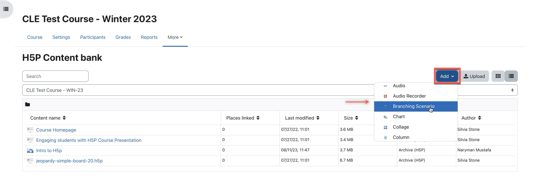3. The Add button can be used to create H5P interactive content from scratch. You can hover over the Add button and scroll down to click on the title of the H5P type you would like to create, e.g. Branching scenario