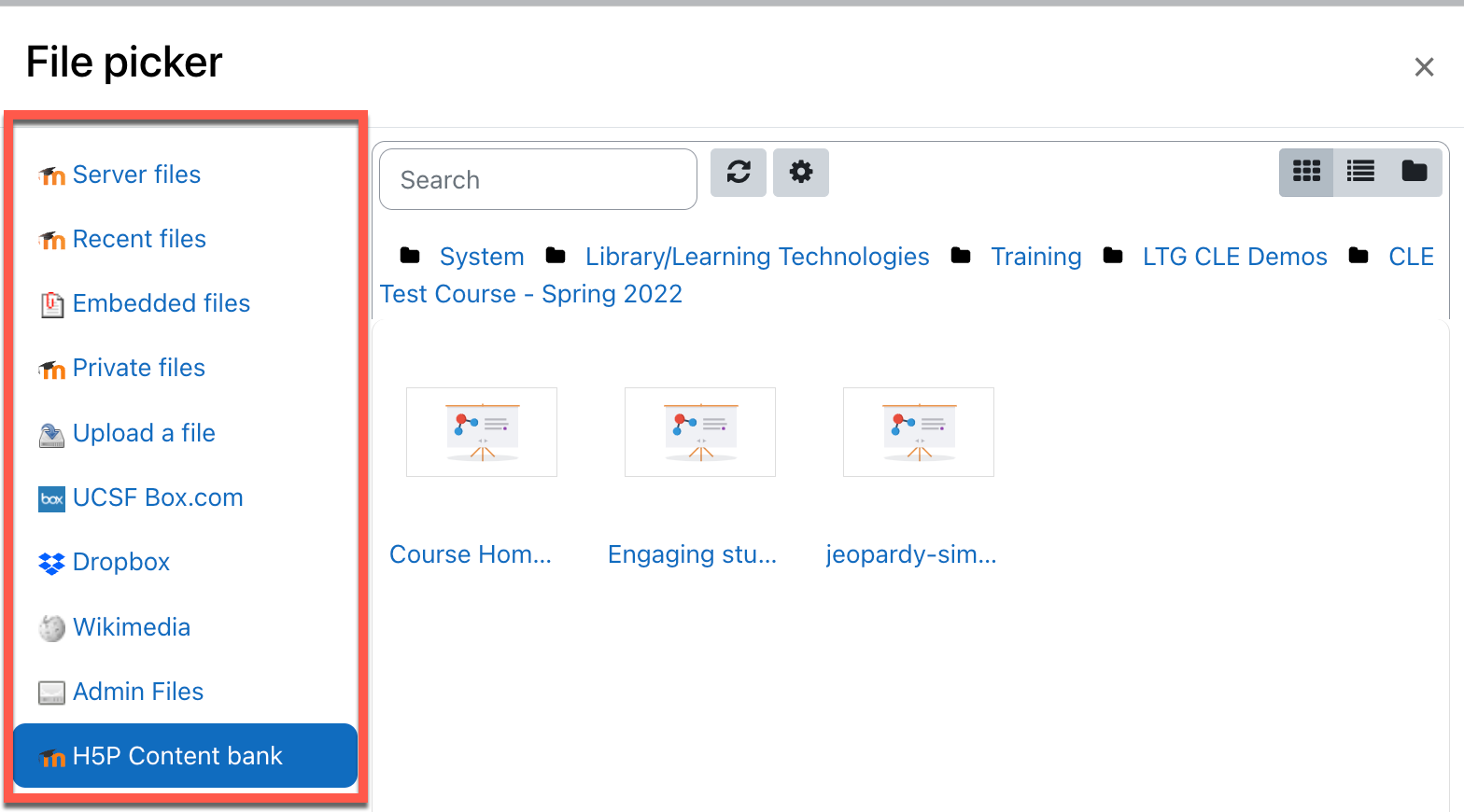- Browse the Content bank repository and select an H5P file.