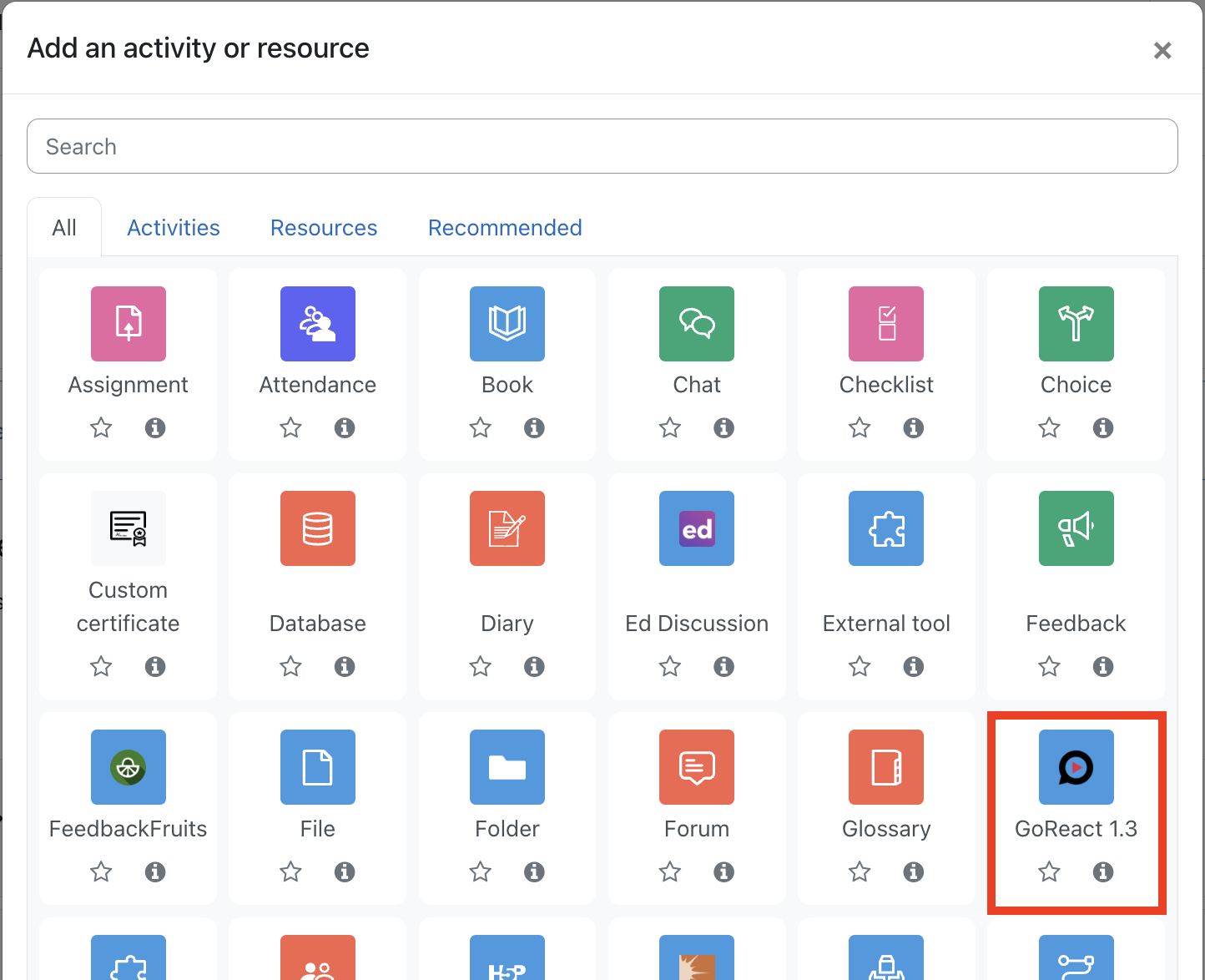 - Choose GoReact 1.3 from the list of activities.
