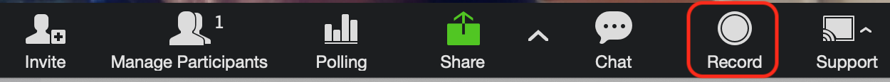 Begin by opening a new Zoom meeting from an invite link, the UCSF Zoom website, or the Zoom application on your computer. Once launched, hosts will see a Record button in the Zoom toolbar. Click the Record button to begin recording.