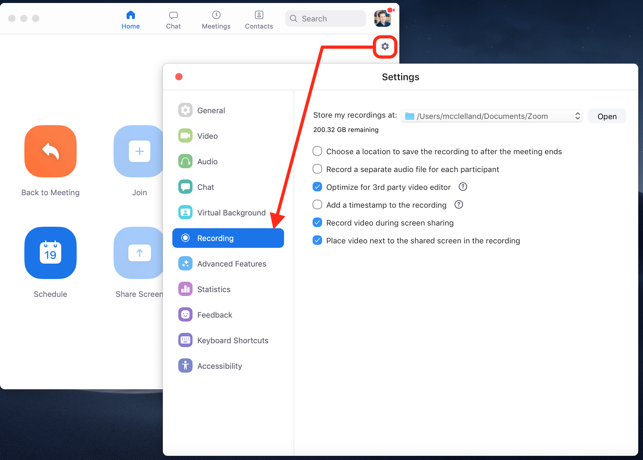 Additional recording settings are available from within the Zoom application. Open Zoom from your Windows start menu or Mac applications folder. Then click the settings icon, and select Recording from the navigation column.