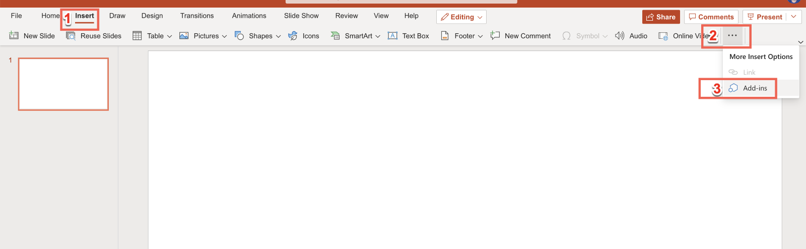 - Click on Insert tab (1), then click on the three dots (2) at the end of the ribbon, then click on Add-ins (3)