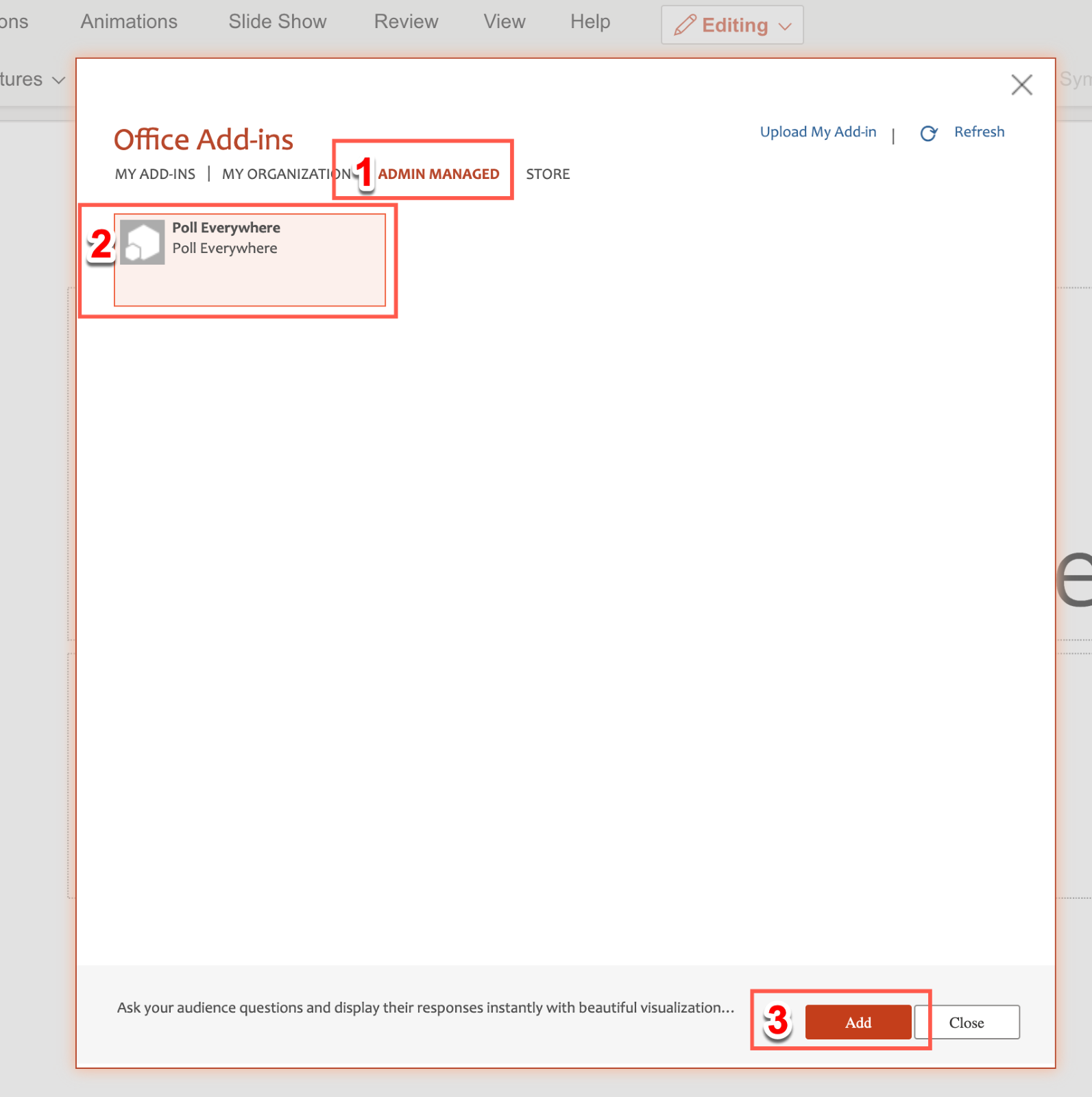 - Click on Admin Managed (1), select Poll Everywhere (2) and click Add (3)
